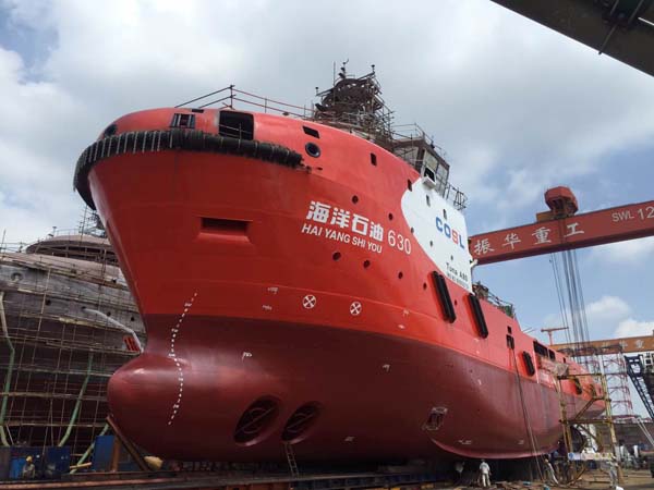 由南通豪通船務(上海事業(yè)部)在上海振華重工承接總包搭載工程的中海油服三艘6500HP油田守護供應船,其中第一艘船“海洋石油630”于8月31日拖移接駁,成功下水。